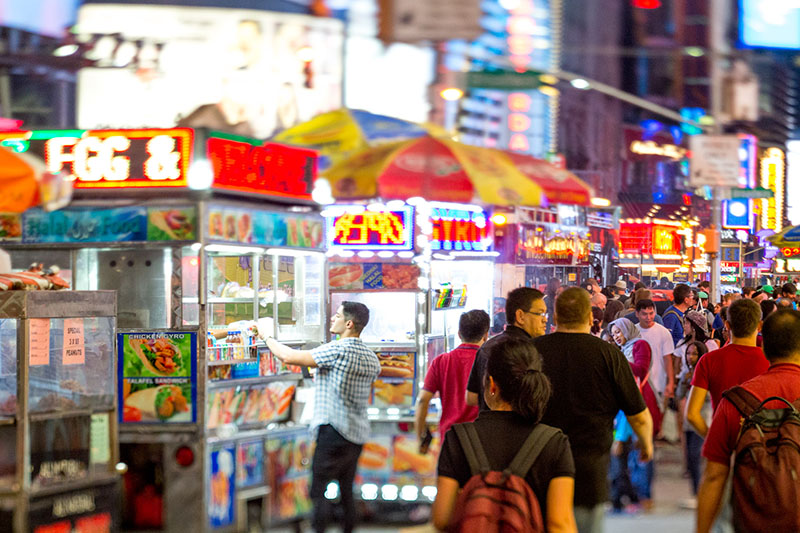 When you’re looking for a food cart you’re not necessarily looking for a culinary masterpiece. A work of perfect food art created by a master chef. You’re not going to find a lightly seasoned branzino paired with an aperitif or a dry aged tomahawk steak paired with a glass of wine. The great joy of a food cart is nostalgia. It’s simple pleasurable foods designed to entice you and bring you in. It’s a harkening back to a time when you were little. And a hot dog with a squirt of ketchup and cheese, hold the relish was all you ever needed or wanted in this world. Sitting there like a young boy in your high chair while your mom makes you food. The immediacy of having it now and the messy joy of just shoving it into your face. Cheese and ketchup squirting out as you take your first bite. And in a city as diverse as New York you can find comfort food from all over the world over by just taking a little stroll. Sizzling meats from the Halal Guys, a taco cart parked next door and a Greek souvlaki food truck next to that. Comfort food. Comfortable food that makes you feel good. A little bit of joy as you prepare to wander back into the night exploring what other little joys you can find in New York.